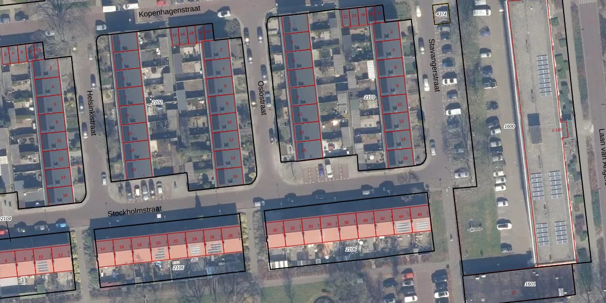Het perceel waarop Oslostraat 15 staat heeft een oppervlakte van 2410 m². Dit is een zeer groot perceel. De perceeloppervlakte wordt geregistreerd door het Kadaster. Gedetailleerde informatie over de maten van dit perceel kunt u vinden in het rapport Kadastrale kaart met maatvoering van Oslostraat 15.