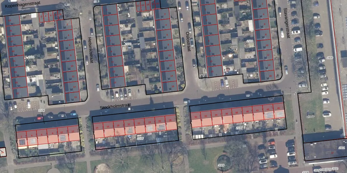 Het perceel waarop Oslostraat 16 staat heeft een oppervlakte van 2415 m². Dit is een zeer groot perceel. De perceeloppervlakte wordt geregistreerd door het Kadaster. Gedetailleerde informatie over de maten van dit perceel kunt u vinden in het rapport Kadastrale kaart met maatvoering van Oslostraat 16.