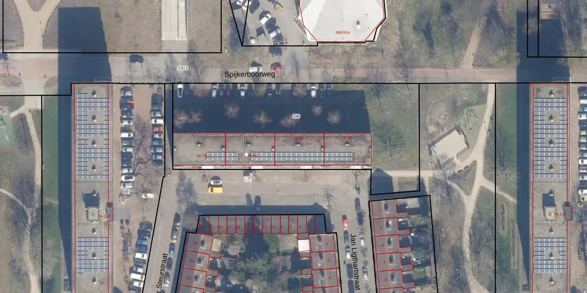 Het perceel waarop het adres ligt is HLM02-X-698. De afkorting 'HLM02' staat voor kadastrale gemeente Haarlem. De oppervlakte van het perceel is 2590 m². Dat is groter dan gemiddeld in Haarlem, waar de gemiddelde perceeloppervlakte op 1125,79 m² ligt. De grootste perceeloppervlakte in de kadastrale gemeente is 46,4 ha. De kleinste oppervlakte bedraagt 0 m². Op het perceel zijn 36 adressen aanwezig. De huidige grenzen van het perceel zijn digitaal in de Basisregistratie Kadaster (BRK) geregistreerd op 08-10-2001.