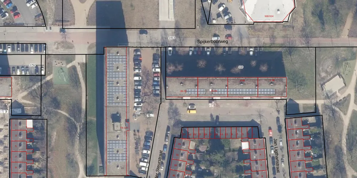 Het perceel waarop het adres ligt is HLM02-X-698. De afkorting 'HLM02' staat voor kadastrale gemeente Haarlem. De oppervlakte van het perceel is 2590 m². Dat is groter dan gemiddeld in Haarlem, waar de gemiddelde perceeloppervlakte op 1125,79 m² ligt. De grootste perceeloppervlakte in de kadastrale gemeente is 46,4 ha. De kleinste oppervlakte bedraagt 0 m². Op het perceel liggen in totaal 36 adressen. De huidige grenzen van het perceel zijn digitaal in de Basisregistratie Kadaster (BRK) geregistreerd op 08-10-2001.