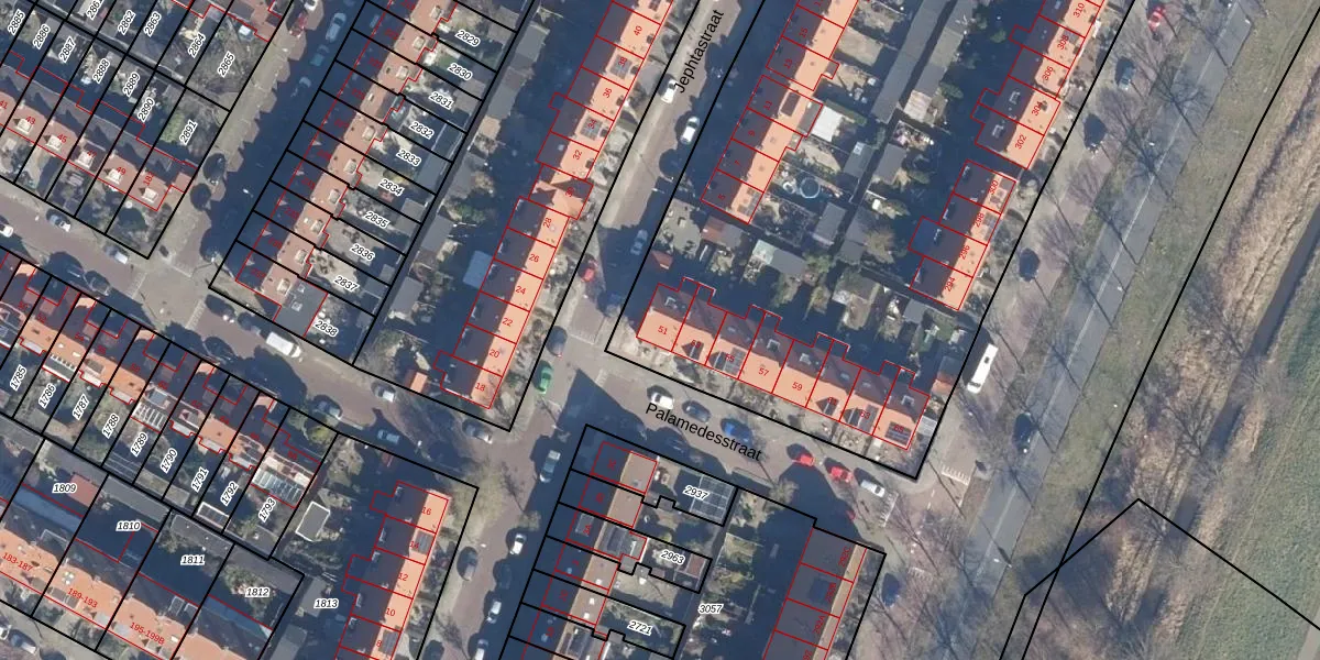 Het perceel waarop Palamedesstraat 51 staat heeft een oppervlakte van 7530 m². Dit is een zeer groot perceel. De perceeloppervlakte wordt geregistreerd door het Kadaster. Gedetailleerde informatie over de maten van dit perceel kunt u vinden in het rapport Kadastrale kaart met maatvoering van Palamedesstraat 51.