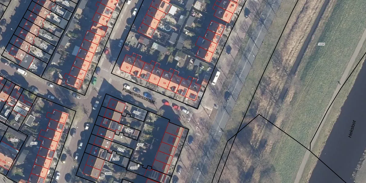 Het perceel waarop Palamedesstraat 63 staat heeft een oppervlakte van 7530 m². Dit is een zeer groot perceel. De perceeloppervlakte wordt geregistreerd door het Kadaster. Gedetailleerde informatie over de maten van dit perceel kunt u vinden in het rapport Kadastrale kaart met maatvoering van Palamedesstraat 63.