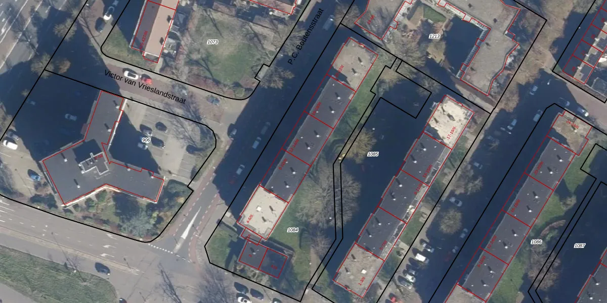 Het perceel waarop P.C. Boutensstraat 12-II staat heeft een oppervlakte van 2438 m². Dit is een zeer groot perceel. De perceeloppervlakte wordt geregistreerd door het Kadaster. Gedetailleerde informatie over de maten van dit perceel kunt u vinden in het rapport Kadastrale kaart met maatvoering van P.C. Boutensstraat 12-II.