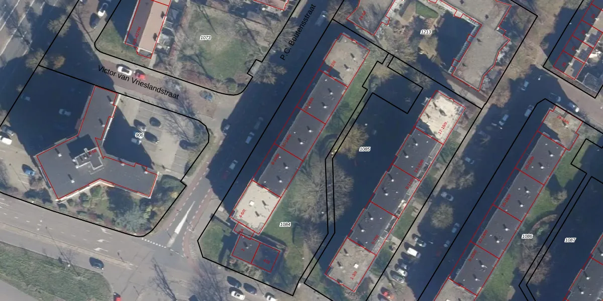 Het perceel waarop P.C. Boutensstraat 12-III staat heeft een oppervlakte van 2438 m². Dit is een zeer groot perceel. De perceeloppervlakte wordt geregistreerd door het Kadaster. Gedetailleerde informatie over de maten van dit perceel kunt u vinden in het rapport Kadastrale kaart met maatvoering van P.C. Boutensstraat 12-III.