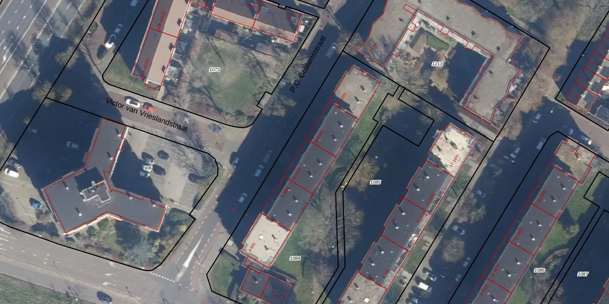 Het perceel waarop P.C. Boutensstraat 14 staat heeft een oppervlakte van 2438 m². Dit is een zeer groot perceel. De perceeloppervlakte wordt geregistreerd door het Kadaster. Gedetailleerde informatie over de maten van dit perceel kunt u vinden in het rapport Kadastrale kaart met maatvoering van P.C. Boutensstraat 14.