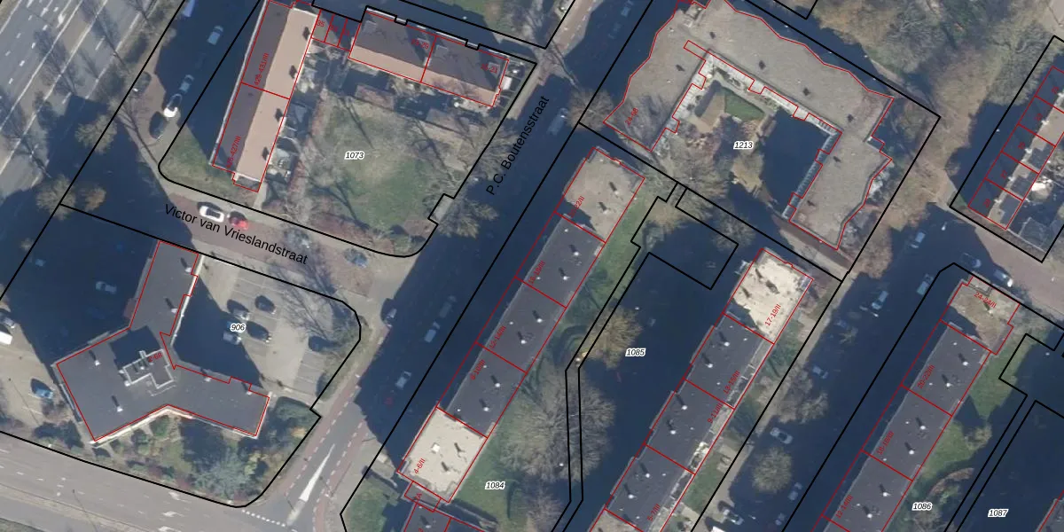 Het perceel waarop P.C. Boutensstraat 16 staat heeft een oppervlakte van 2438 m². Dit is een zeer groot perceel. De perceeloppervlakte wordt geregistreerd door het Kadaster. Gedetailleerde informatie over de maten van dit perceel kunt u vinden in het rapport Kadastrale kaart met maatvoering van P.C. Boutensstraat 16.