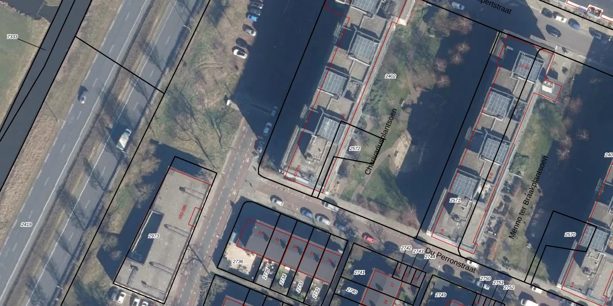 Het perceel waarop P.C. Boutensstraat 172 staat heeft een oppervlakte van 3930 m². Dit is een zeer groot perceel. De perceeloppervlakte wordt geregistreerd door het Kadaster. Gedetailleerde informatie over de maten van dit perceel kunt u vinden in het rapport Kadastrale kaart met maatvoering van P.C. Boutensstraat 172.