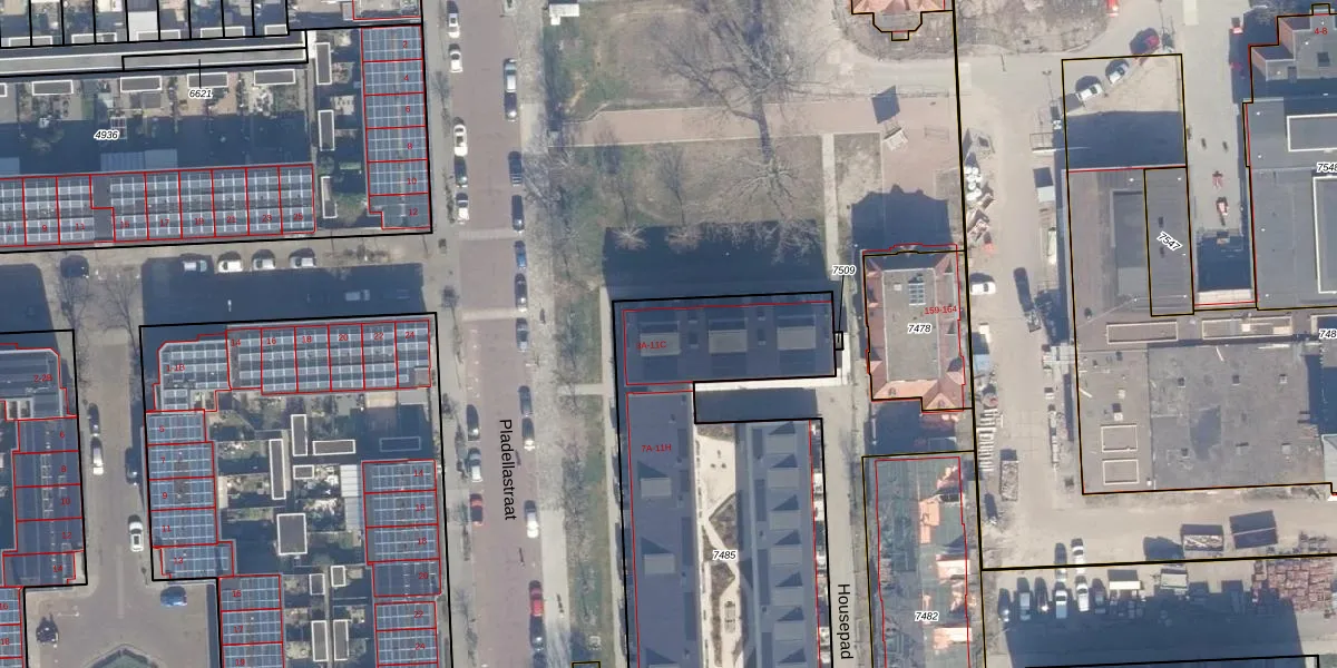 Pladellastraat 5-B is gelegen op kadastraal perceel HLM01E7485. Deze kadastrale aanduiding is uniek en wordt gebruikt door het Kadaster om eigendomsrechten en andere zakelijke rechten vast te leggen. Het perceel maakt onderdeel uit van de kadastrale gemeente Haarlem.