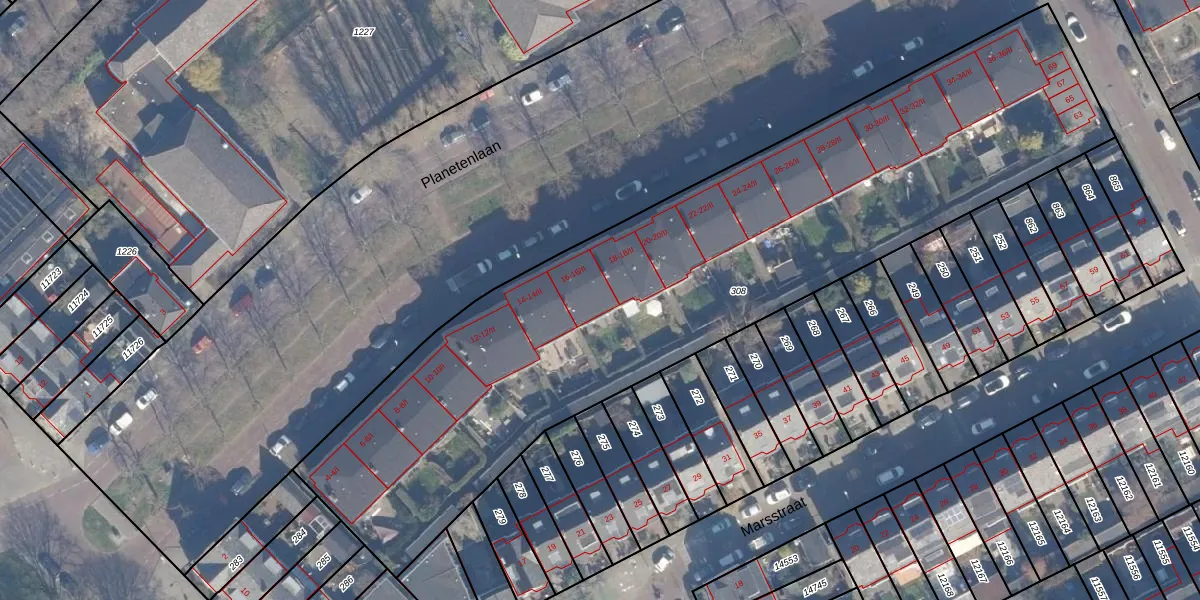 Het perceel waarop Planetenlaan 16-II staat heeft een oppervlakte van 3633 m². Dit is een zeer groot perceel. De perceeloppervlakte wordt geregistreerd door het Kadaster. Gedetailleerde informatie over de maten van dit perceel kunt u vinden in het rapport Kadastrale kaart met maatvoering van Planetenlaan 16-II.