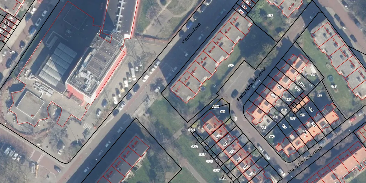 Het perceel waarop Plesmanlaan 22-I staat heeft een oppervlakte van 1621 m². Dit is een zeer groot perceel. De perceeloppervlakte wordt geregistreerd door het Kadaster. Gedetailleerde informatie over de maten van dit perceel kunt u vinden in het rapport Kadastrale kaart met maatvoering van Plesmanlaan 22-I.