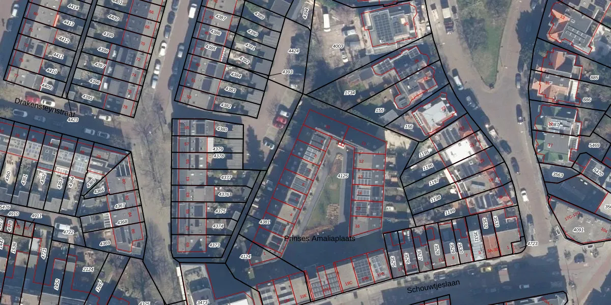 Het perceel waarop Prinses Amaliaplaats 8 staat heeft een oppervlakte van 2539 m². Dit is een zeer groot perceel. De perceeloppervlakte wordt geregistreerd door het Kadaster. Gedetailleerde informatie over de maten van dit perceel kunt u vinden in het rapport Kadastrale kaart met maatvoering van Prinses Amaliaplaats 8.