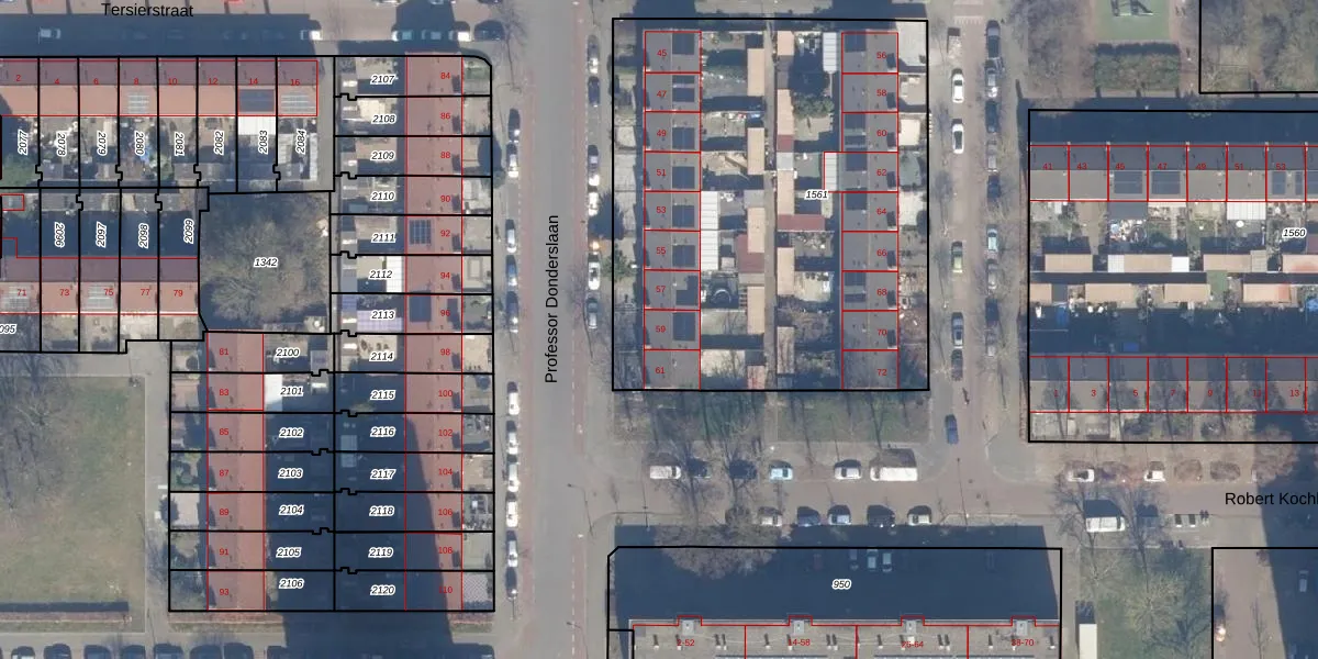 Het perceel waarop Professor Donderslaan 59 staat heeft een oppervlakte van 2686 m². Dit is een zeer groot perceel. De perceeloppervlakte wordt geregistreerd door het Kadaster. Gedetailleerde informatie over de maten van dit perceel kunt u vinden in het rapport Kadastrale kaart met maatvoering van Professor Donderslaan 59.