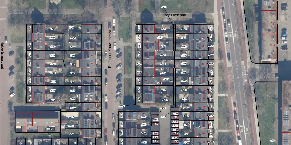 Professor Kouwerstraat 43 is gelegen op kadastraal perceel HLM02P1647. Deze kadastrale aanduiding is uniek en wordt gebruikt door het Kadaster om eigendomsrechten en andere zakelijke rechten vast te leggen. Het perceel maakt onderdeel uit van de kadastrale gemeente Haarlem.