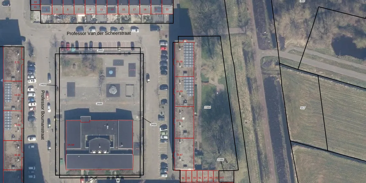 Het perceel waarop Professor Van der Scheerstraat 45 staat heeft een oppervlakte van 3242 m². Dit is een zeer groot perceel. De perceeloppervlakte wordt geregistreerd door het Kadaster. Gedetailleerde informatie over de maten van dit perceel kunt u vinden in het rapport Kadastrale kaart met maatvoering van Professor Van der Scheerstraat 45.