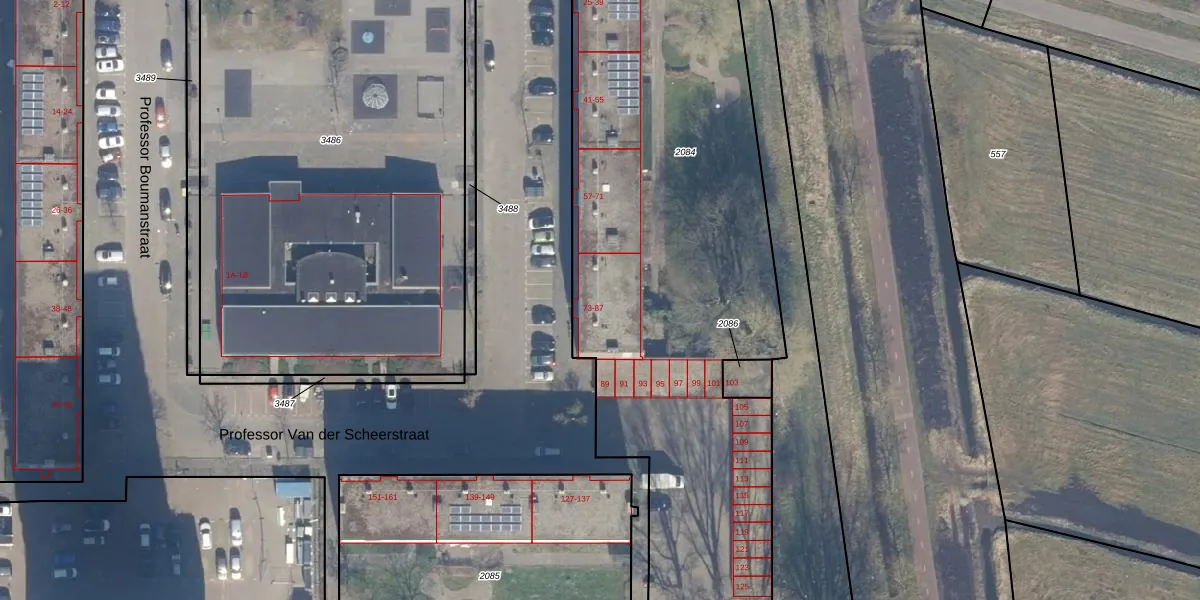 Het perceel waarop Professor Van der Scheerstraat 81 staat heeft een oppervlakte van 3242 m². Dit is een zeer groot perceel. De perceeloppervlakte wordt geregistreerd door het Kadaster. Gedetailleerde informatie over de maten van dit perceel kunt u vinden in het rapport Kadastrale kaart met maatvoering van Professor Van der Scheerstraat 81.