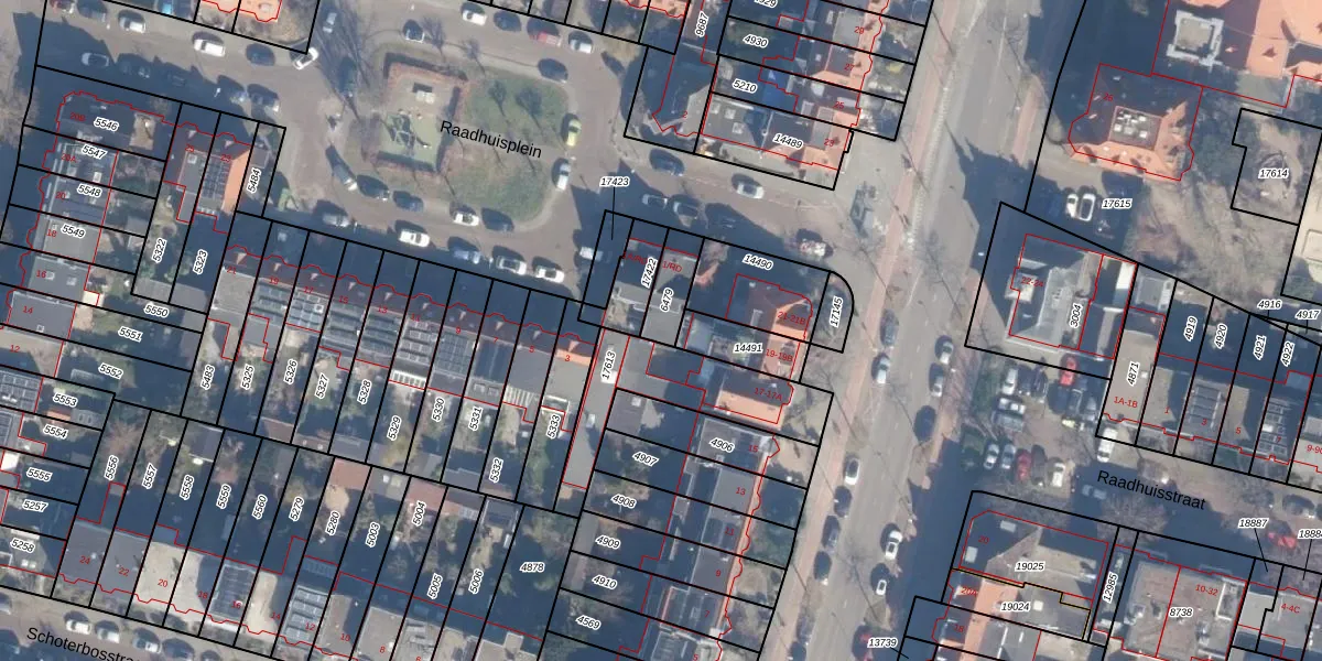 Het perceel waarop Raadhuisplein 1-RD staat heeft een oppervlakte van 82 m². Dit is een klein perceel. De perceeloppervlakte wordt geregistreerd door het Kadaster. Gedetailleerde informatie over de maten van dit perceel kunt u vinden in het rapport Kadastrale kaart met maatvoering van Raadhuisplein 1-RD.