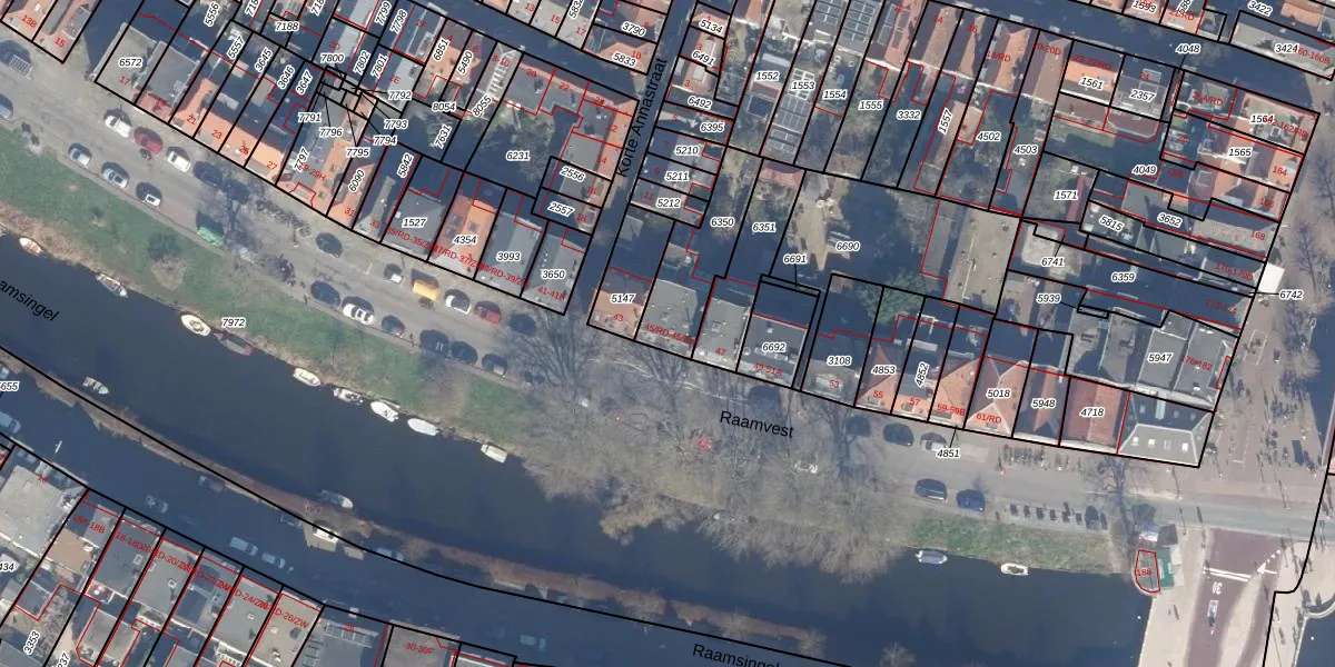 Raamvest 45-ZW is gelegen op kadastraal perceel HLM01C6350. Deze kadastrale aanduiding is uniek en wordt gebruikt door het Kadaster om eigendomsrechten en andere zakelijke rechten vast te leggen. Het perceel maakt onderdeel uit van de kadastrale gemeente Haarlem.