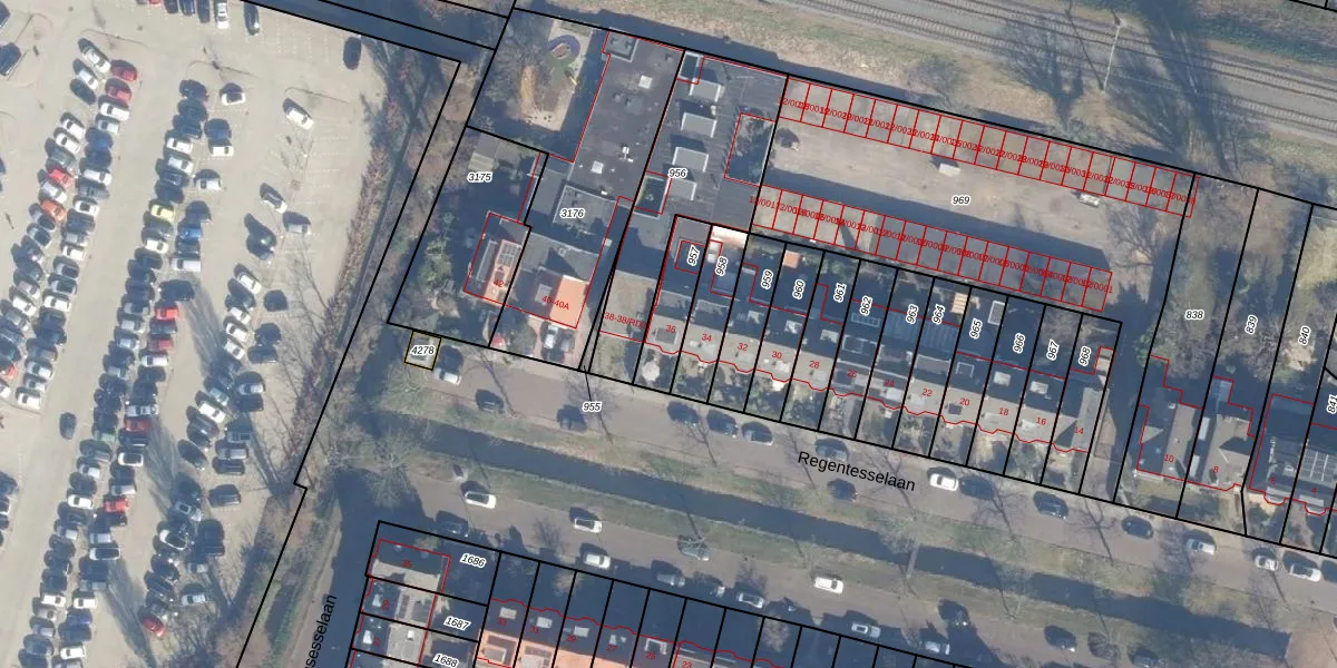 Regentesselaan 36 is gelegen op kadastraal perceel HLM02T957. Deze kadastrale aanduiding is uniek en wordt gebruikt door het Kadaster om eigendomsrechten en andere zakelijke rechten vast te leggen. Het perceel maakt onderdeel uit van de kadastrale gemeente Haarlem.