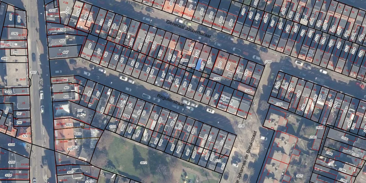 Het perceel waarop Regulierstraat 25 staat heeft een oppervlakte van 61 m². Dit is een klein perceel. De perceeloppervlakte wordt geregistreerd door het Kadaster. Gedetailleerde informatie over de maten van dit perceel kunt u vinden in het rapport Kadastrale kaart met maatvoering van Regulierstraat 25.