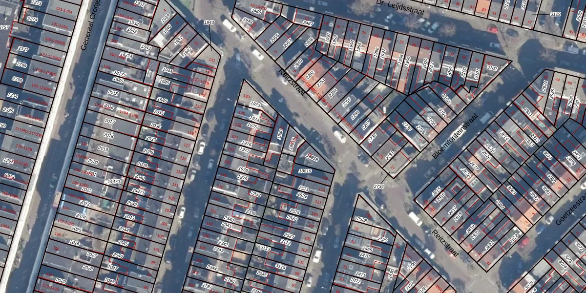 Het perceel waarop Reitzstraat 16-A staat heeft een oppervlakte van 47 m². Dit is een klein perceel. De perceeloppervlakte wordt geregistreerd door het Kadaster. Gedetailleerde informatie over de maten van dit perceel kunt u vinden in het rapport Kadastrale kaart met maatvoering van Reitzstraat 16-A.