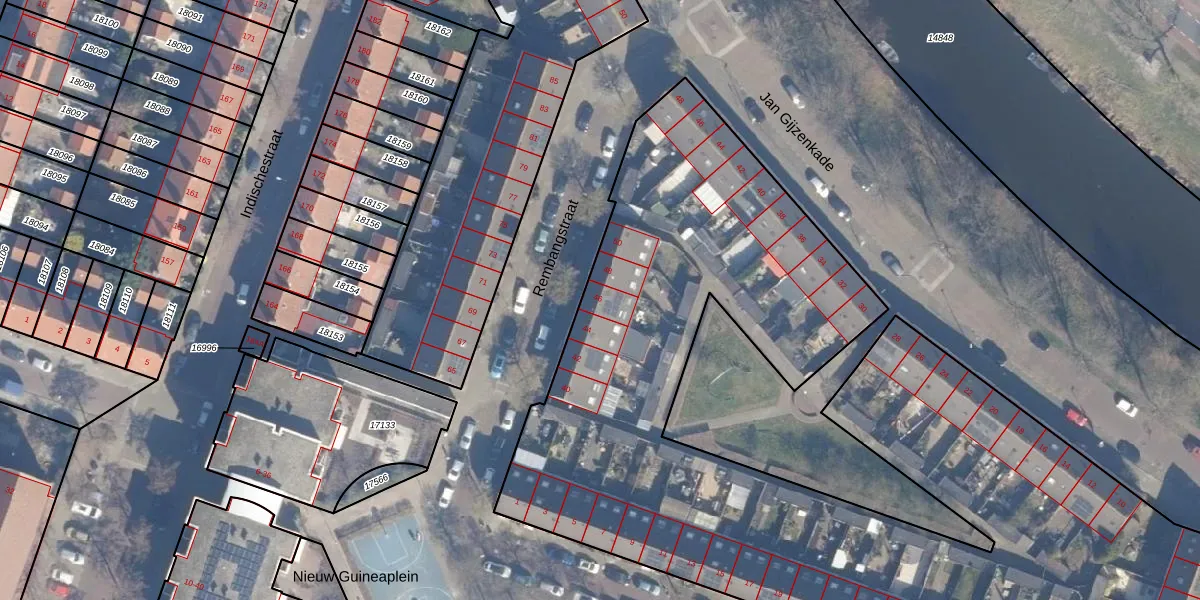 Het perceel waarop Rembangstraat 46 staat heeft een oppervlakte van 5530 m². Dit is een zeer groot perceel. De perceeloppervlakte wordt geregistreerd door het Kadaster. Gedetailleerde informatie over de maten van dit perceel kunt u vinden in het rapport Kadastrale kaart met maatvoering van Rembangstraat 46.