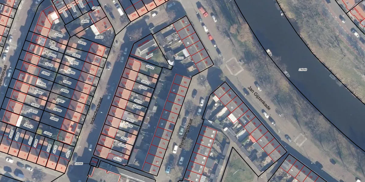 Het perceel waarop Rembangstraat 83 staat heeft een oppervlakte van 1636 m². Dit is een zeer groot perceel. De perceeloppervlakte wordt geregistreerd door het Kadaster. Gedetailleerde informatie over de maten van dit perceel kunt u vinden in het rapport Kadastrale kaart met maatvoering van Rembangstraat 83.