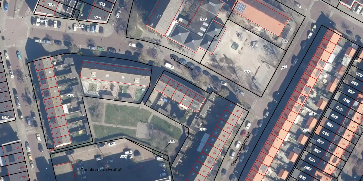 Het perceel waarop Reviusstraat 20 staat heeft een oppervlakte van 2010 m². Dit is een zeer groot perceel. De perceeloppervlakte wordt geregistreerd door het Kadaster. Gedetailleerde informatie over de maten van dit perceel kunt u vinden in het rapport Kadastrale kaart met maatvoering van Reviusstraat 20.