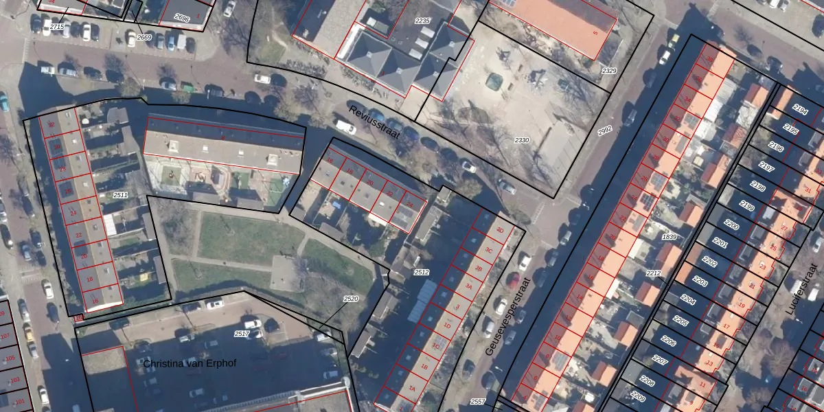 Het perceel waarop Reviusstraat 24 staat heeft een oppervlakte van 2010 m². Dit is een zeer groot perceel. De perceeloppervlakte wordt geregistreerd door het Kadaster. Gedetailleerde informatie over de maten van dit perceel kunt u vinden in het rapport Kadastrale kaart met maatvoering van Reviusstraat 24.