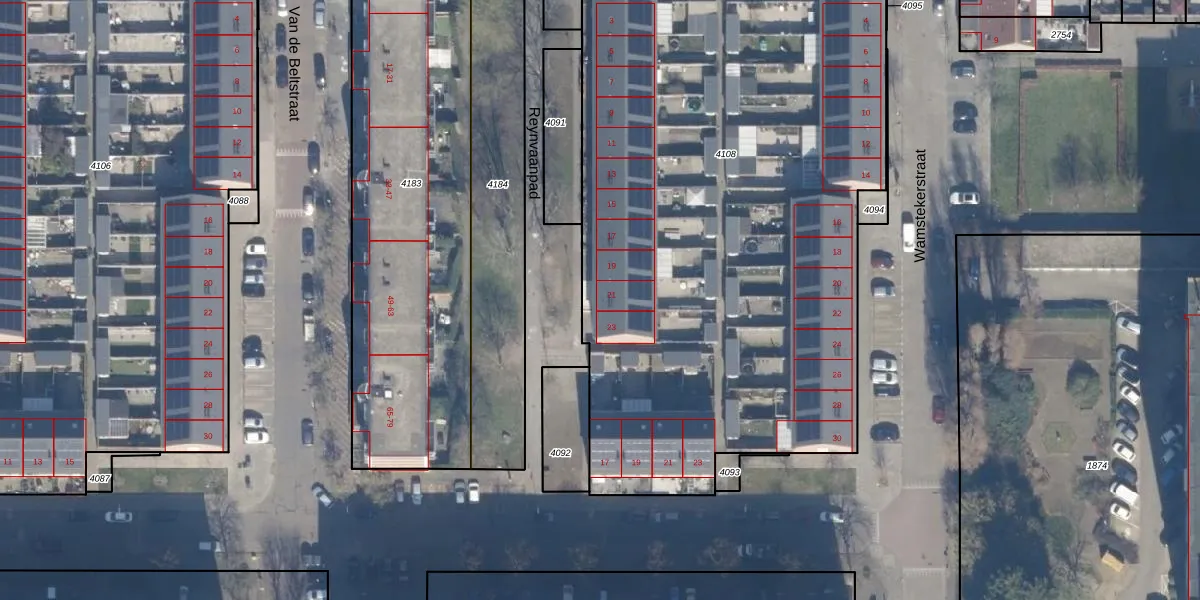 Reynvaanpad 21 is gelegen op kadastraal perceel HLM02P4108. Deze kadastrale aanduiding is uniek en wordt gebruikt door het Kadaster om eigendomsrechten en andere zakelijke rechten vast te leggen. Het perceel maakt onderdeel uit van de kadastrale gemeente Haarlem.