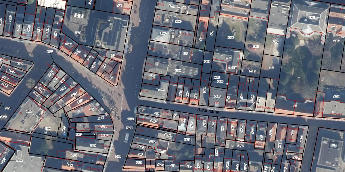 Het perceel waarop Ridderstraat 1-F staat heeft een oppervlakte van 374 m². Dit is een groot perceel. De perceeloppervlakte wordt geregistreerd door het Kadaster. Gedetailleerde informatie over de maten van dit perceel kunt u vinden in het rapport Kadastrale kaart met maatvoering van Ridderstraat 1-F.