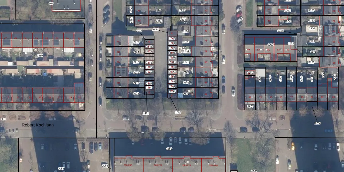 Het perceel waarop Robert Kochlaan 63 staat heeft een oppervlakte van 15 m². Dit is een klein perceel. De perceeloppervlakte wordt geregistreerd door het Kadaster. Gedetailleerde informatie over de maten van dit perceel kunt u vinden in het rapport Kadastrale kaart met maatvoering van Robert Kochlaan 63.