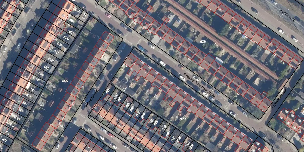 Het perceel waarop Roemer Visscherstraat 116 staat heeft een oppervlakte van 2760 m². Dit is een zeer groot perceel. De perceeloppervlakte wordt geregistreerd door het Kadaster. Gedetailleerde informatie over de maten van dit perceel kunt u vinden in het rapport Kadastrale kaart met maatvoering van Roemer Visscherstraat 116.