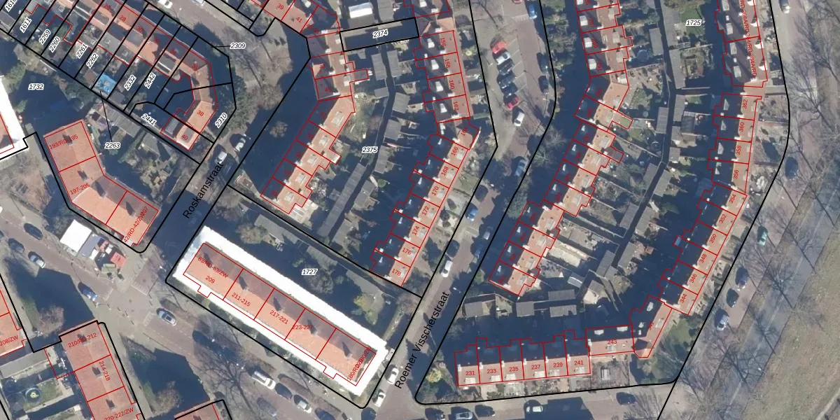 Het perceel waarop Roemer Visscherstraat 172 staat heeft een oppervlakte van 3759 m². Dit is een zeer groot perceel. De perceeloppervlakte wordt geregistreerd door het Kadaster. Gedetailleerde informatie over de maten van dit perceel kunt u vinden in het rapport Kadastrale kaart met maatvoering van Roemer Visscherstraat 172.