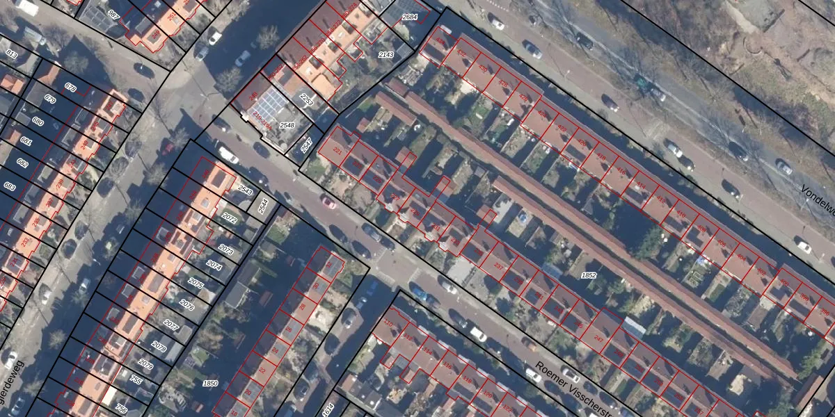 Het perceel waarop Roemer Visscherstraat 229 staat heeft een oppervlakte van 6791 m². Dit is een zeer groot perceel. De perceeloppervlakte wordt geregistreerd door het Kadaster. Gedetailleerde informatie over de maten van dit perceel kunt u vinden in het rapport Kadastrale kaart met maatvoering van Roemer Visscherstraat 229.