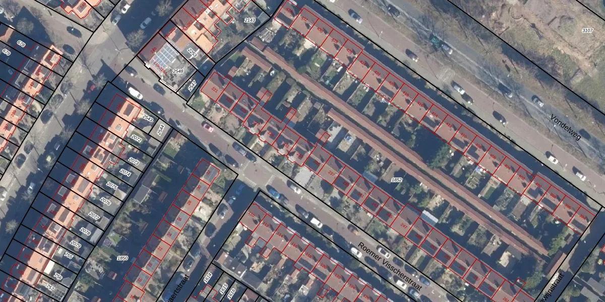 Het perceel waarop Roemer Visscherstraat 233 staat heeft een oppervlakte van 6791 m². Dit is een zeer groot perceel. De perceeloppervlakte wordt geregistreerd door het Kadaster. Gedetailleerde informatie over de maten van dit perceel kunt u vinden in het rapport Kadastrale kaart met maatvoering van Roemer Visscherstraat 233.