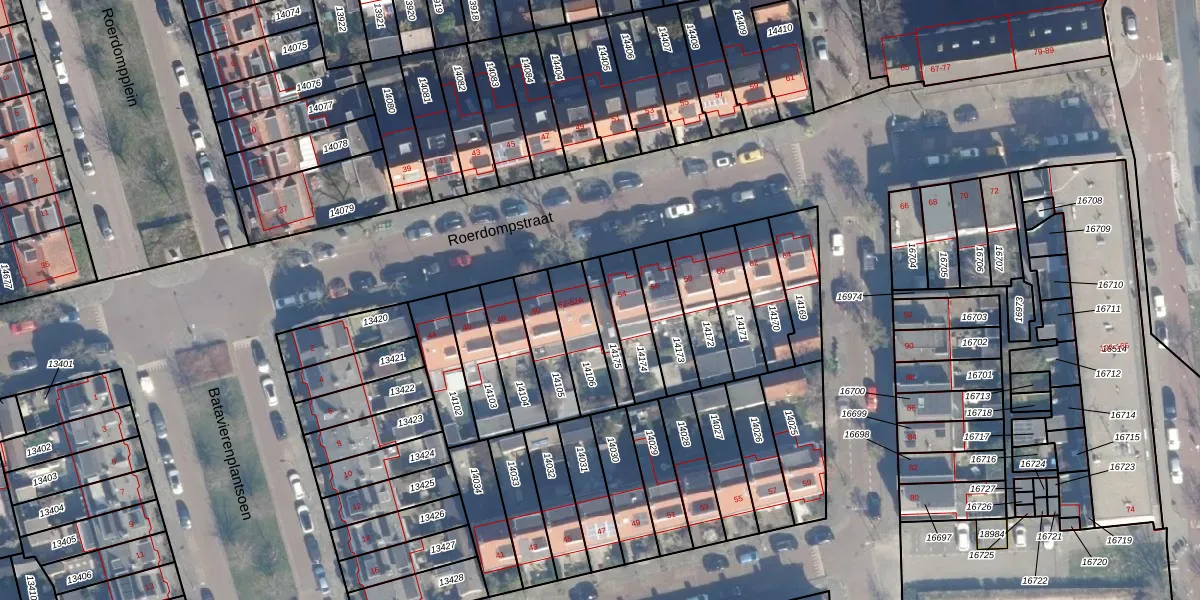 Het perceel waarop Roerdompstraat 52-A staat heeft een oppervlakte van 76 m². Dit is een klein perceel. De perceeloppervlakte wordt geregistreerd door het Kadaster. Gedetailleerde informatie over de maten van dit perceel kunt u vinden in het rapport Kadastrale kaart met maatvoering van Roerdompstraat 52-A.