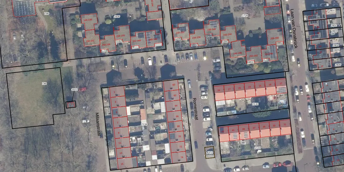 Het perceel waarop Romestraat 60 staat heeft een oppervlakte van 2335 m². Dit is een zeer groot perceel. De perceeloppervlakte wordt geregistreerd door het Kadaster. Gedetailleerde informatie over de maten van dit perceel kunt u vinden in het rapport Kadastrale kaart met maatvoering van Romestraat 60.