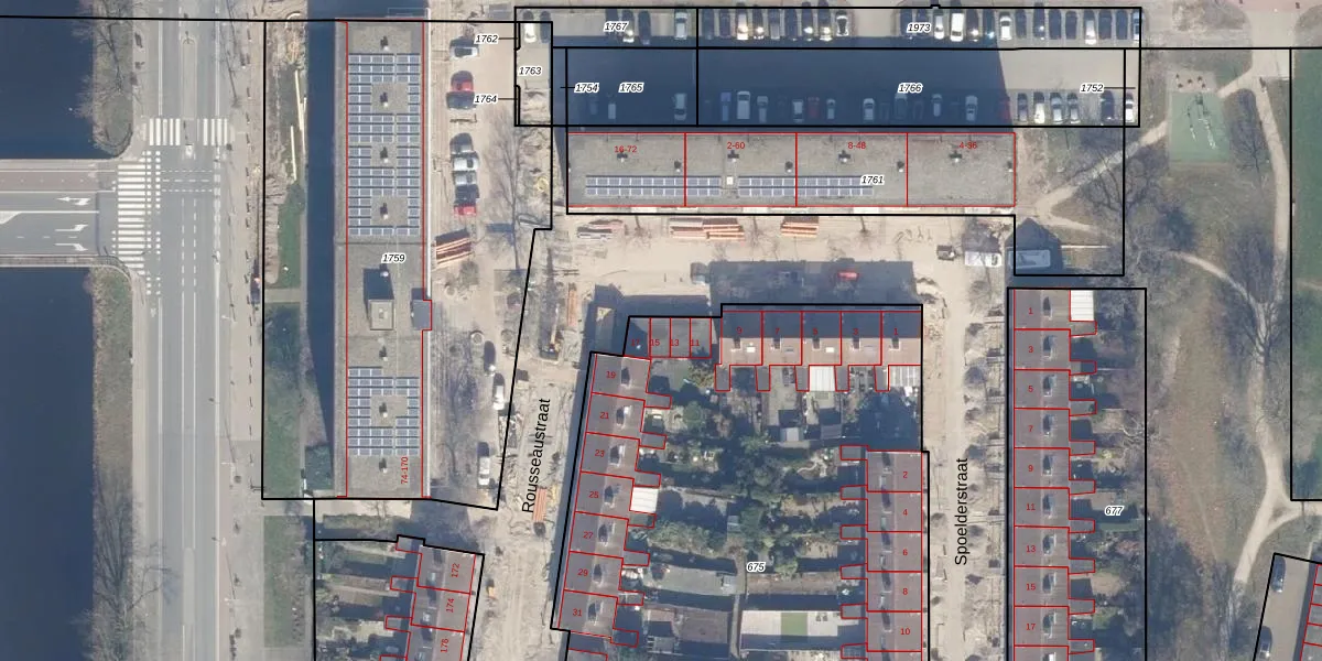 Het perceel waarop Rousseaustraat 15 staat heeft een oppervlakte van 3835 m². Dit is een zeer groot perceel. De perceeloppervlakte wordt geregistreerd door het Kadaster. Gedetailleerde informatie over de maten van dit perceel kunt u vinden in het rapport Kadastrale kaart met maatvoering van Rousseaustraat 15.