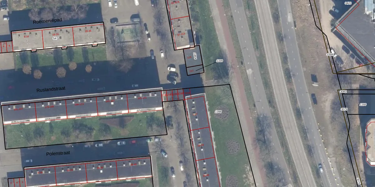 Het perceel waarop Ruslandstraat 123-A staat heeft een oppervlakte van 5710 m². Dit is een zeer groot perceel. De perceeloppervlakte wordt geregistreerd door het Kadaster. Gedetailleerde informatie over de maten van dit perceel kunt u vinden in het rapport Kadastrale kaart met maatvoering van Ruslandstraat 123-A.