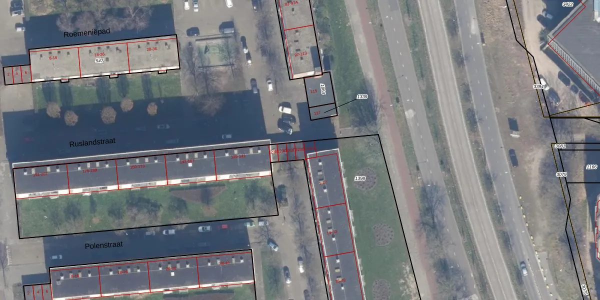 Het perceel waarop Ruslandstraat 123-B staat heeft een oppervlakte van 5710 m². Dit is een zeer groot perceel. De perceeloppervlakte wordt geregistreerd door het Kadaster. Gedetailleerde informatie over de maten van dit perceel kunt u vinden in het rapport Kadastrale kaart met maatvoering van Ruslandstraat 123-B.