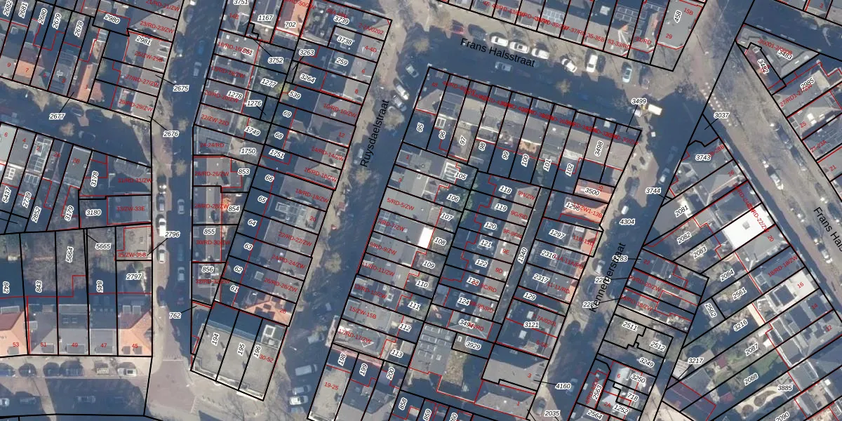 Ruysdaelstraat 5-RD is gelegen op kadastraal perceel HLM01G107. Deze kadastrale aanduiding is uniek en wordt gebruikt door het Kadaster om eigendomsrechten en andere zakelijke rechten vast te leggen. Het perceel maakt onderdeel uit van de kadastrale gemeente Haarlem.