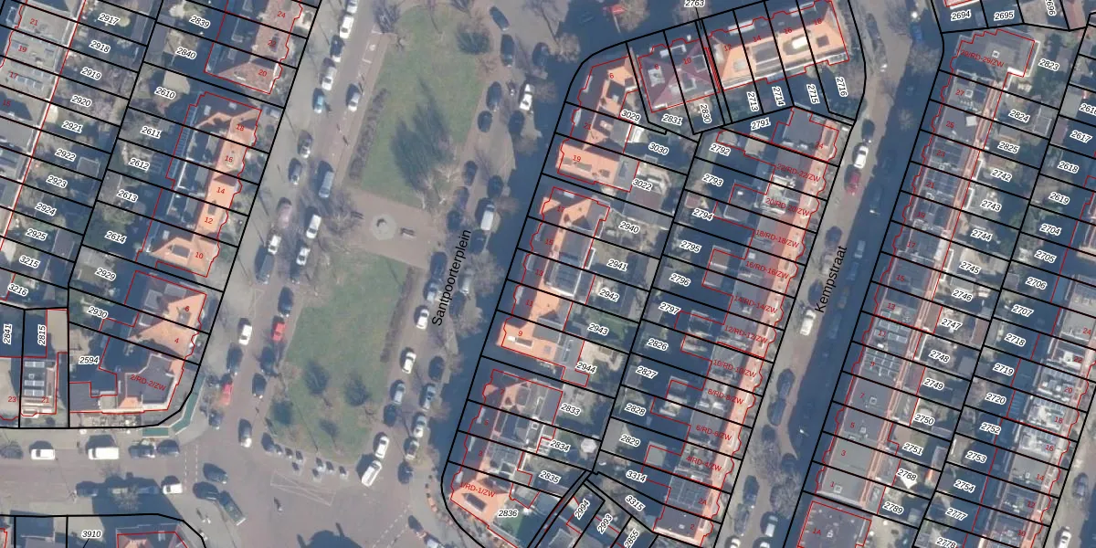 Het perceel waarop Santpoorterplein 13 staat heeft een oppervlakte van 156 m². Dit is een middelgroot perceel. De perceeloppervlakte wordt geregistreerd door het Kadaster. Gedetailleerde informatie over de maten van dit perceel kunt u vinden in het rapport Kadastrale kaart met maatvoering van Santpoorterplein 13.