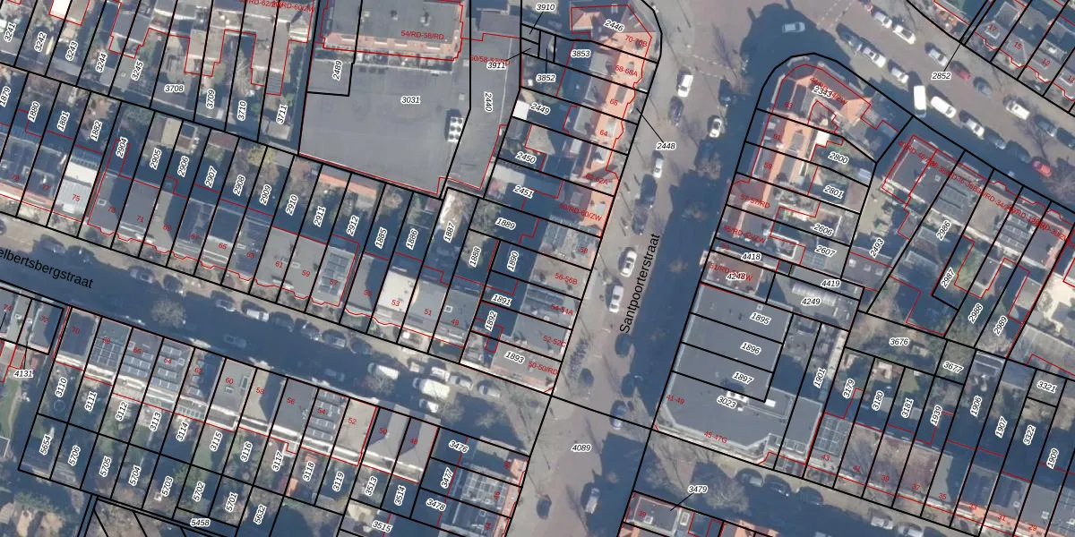 Santpoorterstraat 56-B is gelegen op kadastraal perceel HLM01G1890. Deze kadastrale aanduiding is uniek en wordt gebruikt door het Kadaster om eigendomsrechten en andere zakelijke rechten vast te leggen. Het perceel maakt onderdeel uit van de kadastrale gemeente Haarlem.