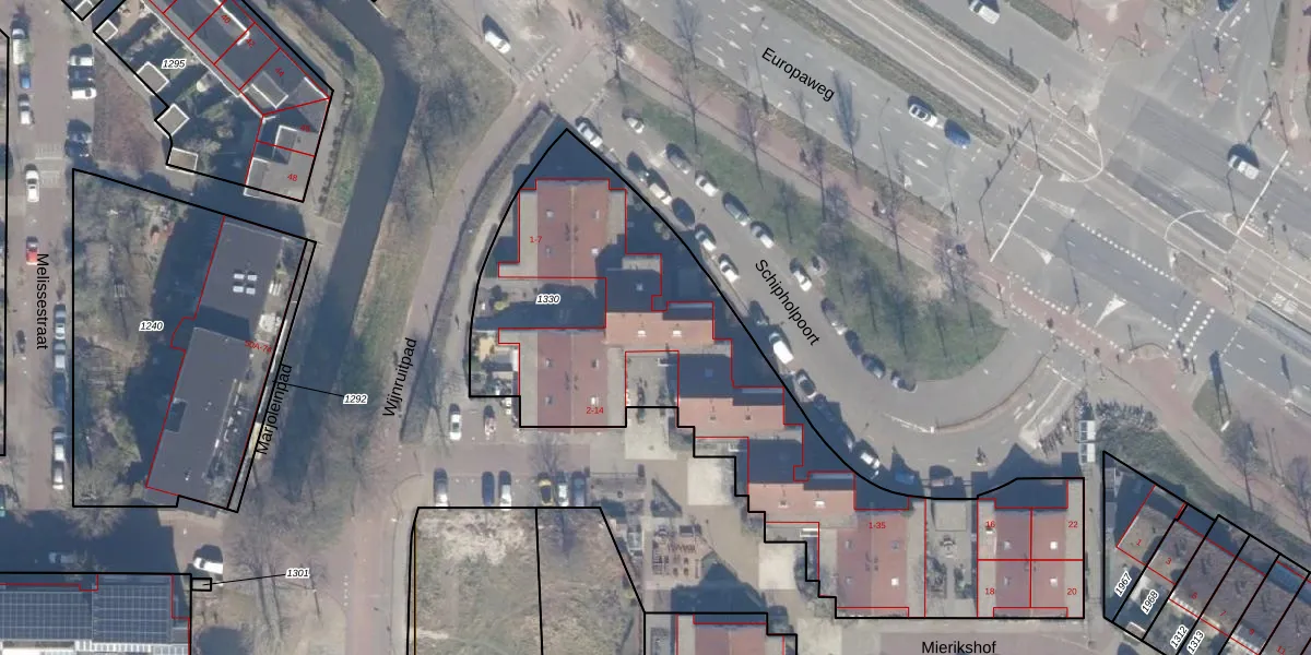 Het perceel waarop Schipholpoort 21 staat heeft een oppervlakte van 2450 m². Dit is een zeer groot perceel. De perceeloppervlakte wordt geregistreerd door het Kadaster. Gedetailleerde informatie over de maten van dit perceel kunt u vinden in het rapport Kadastrale kaart met maatvoering van Schipholpoort 21.