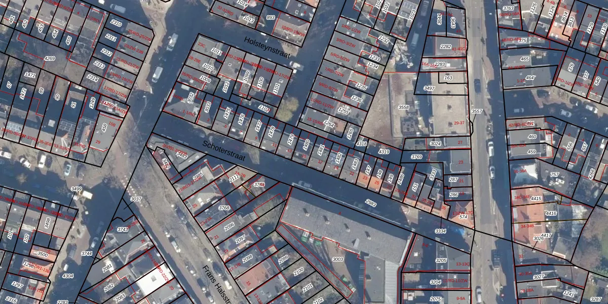 Schoterstraat 15 is gelegen op kadastraal perceel HLM01G1480. Deze kadastrale aanduiding is uniek en wordt gebruikt door het Kadaster om eigendomsrechten en andere zakelijke rechten vast te leggen. Het perceel maakt onderdeel uit van de kadastrale gemeente Haarlem.