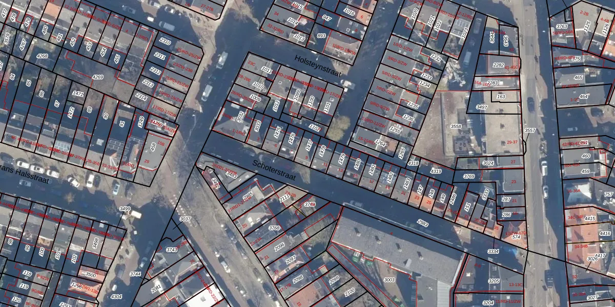 Schoterstraat 9 is gelegen op kadastraal perceel HLM01G1477. Deze kadastrale aanduiding is uniek en wordt gebruikt door het Kadaster om eigendomsrechten en andere zakelijke rechten vast te leggen. Het perceel maakt onderdeel uit van de kadastrale gemeente Haarlem.