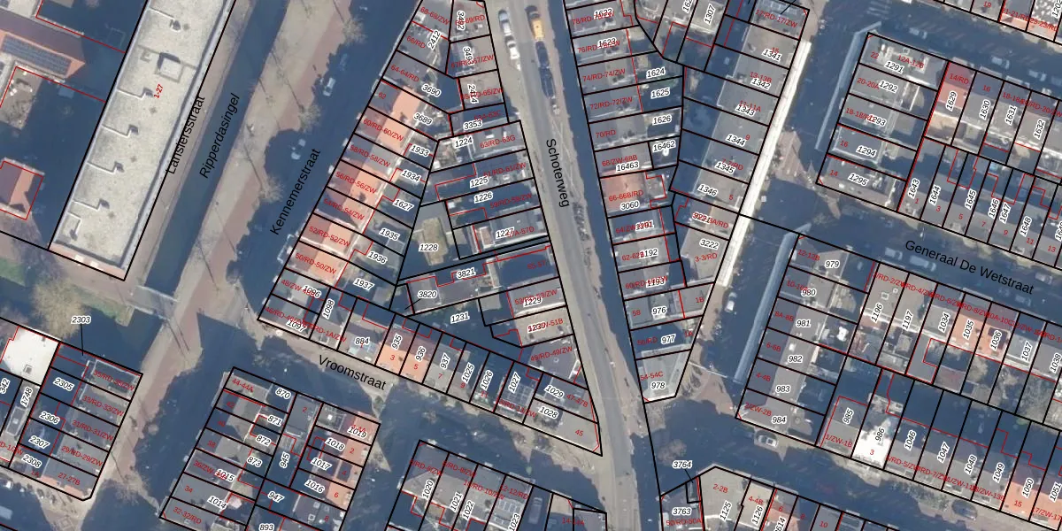Schoterweg 55-A is gelegen op kadastraal perceel HLM01G3821. Deze kadastrale aanduiding is uniek en wordt gebruikt door het Kadaster om eigendomsrechten en andere zakelijke rechten vast te leggen. Het perceel maakt onderdeel uit van de kadastrale gemeente Haarlem.