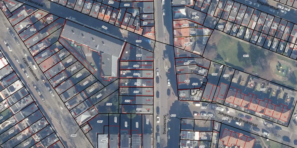 Schoterweg 9 is gelegen op kadastraal perceel HLM01B2075. Deze kadastrale aanduiding is uniek en wordt gebruikt door het Kadaster om eigendomsrechten en andere zakelijke rechten vast te leggen. Het perceel maakt onderdeel uit van de kadastrale gemeente Haarlem.