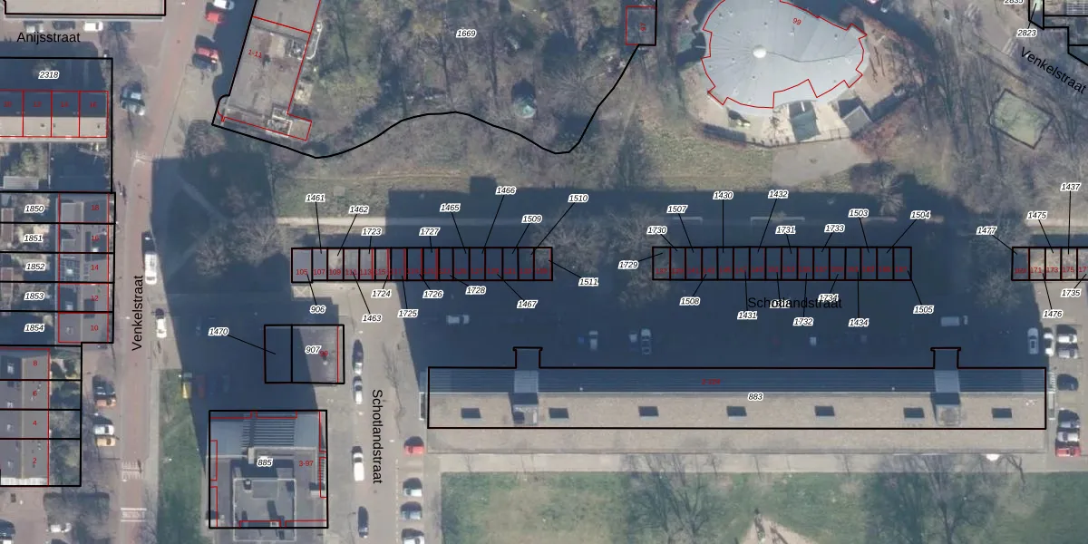 Het perceel waarop Schotlandstraat 135 staat heeft een oppervlakte van 18 m². Dit is een klein perceel. De perceeloppervlakte wordt geregistreerd door het Kadaster. Gedetailleerde informatie over de maten van dit perceel kunt u vinden in het rapport Kadastrale kaart met maatvoering van Schotlandstraat 135.