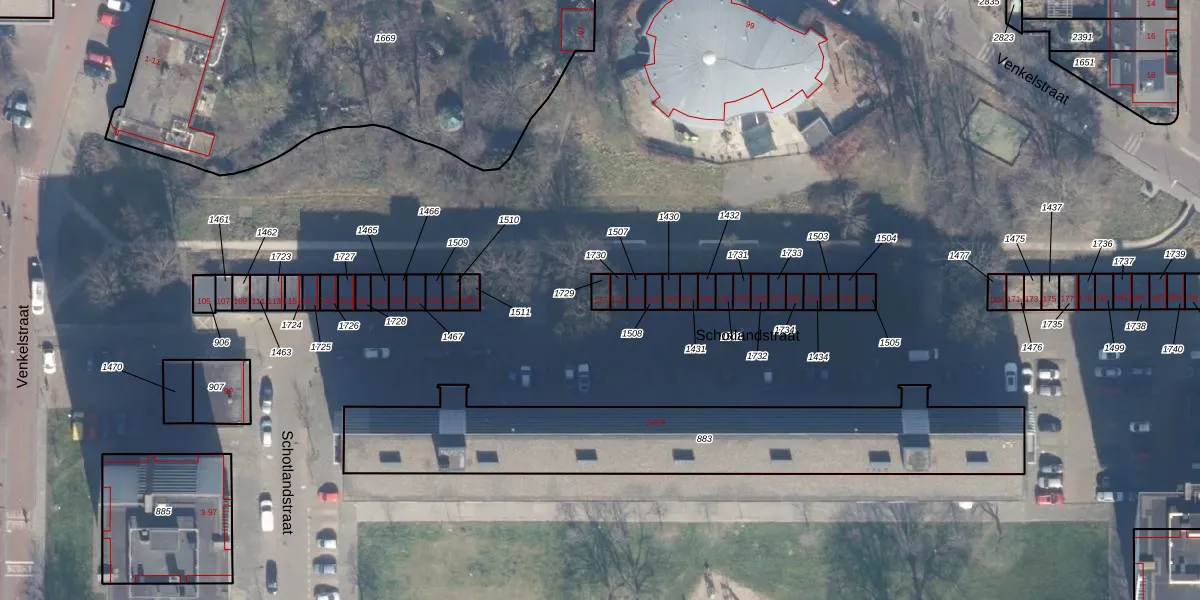 Gebruik de zoekbalk of klik op een perceel voor informatie over de adressen binnen dit perceel.